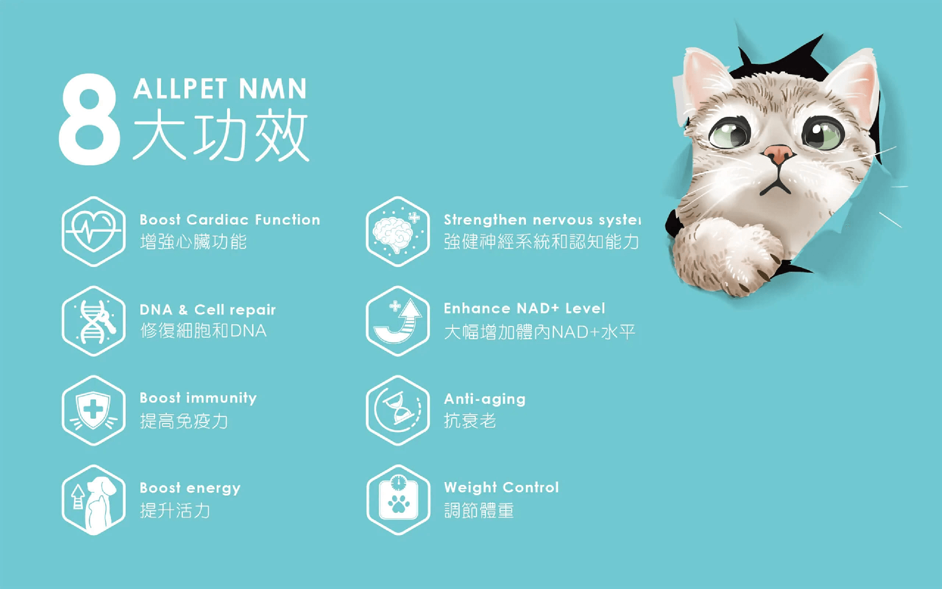 寵物隨着年紀的增長,體內的幹細胞和NAD+的數量都會持續下降,促使新陳代謝大幅下降令寵物開始衰老。當幹細胞和NAD+越來越少,細胞就得不到足夠的能量去進行工作,例如細胞分裂DNA複裂等等都會緩慢進行,甚至令器官及組織會出現錯誤,引致癌症及衰竭等各種疾病。經美國科學權威實證,NAD+(諾加因子)有效延長壽命20%。當身體吸收NMN後,就可以在寵物內轉化成NAD+並促進細胞及組織的新陳代謝、修復及再生。另外ALLPET NMN 含有納豆精華,為細胞提供能量同時促進多種身體細胞及組織的修復和再生,與NMN產生協同效應。
